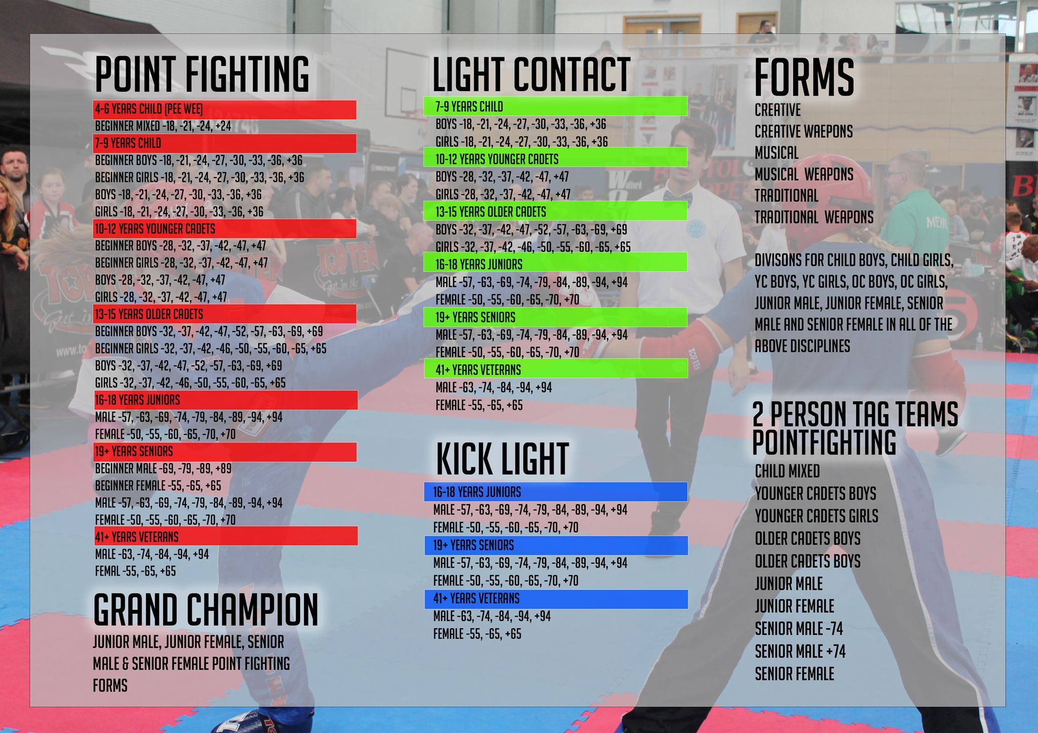 9.00AM - DIVISIONS START : LIGHT CONTACT, KICK LIGHT, FORMS, TAG TEAMS, GRAND CHAMPION ALL DAY